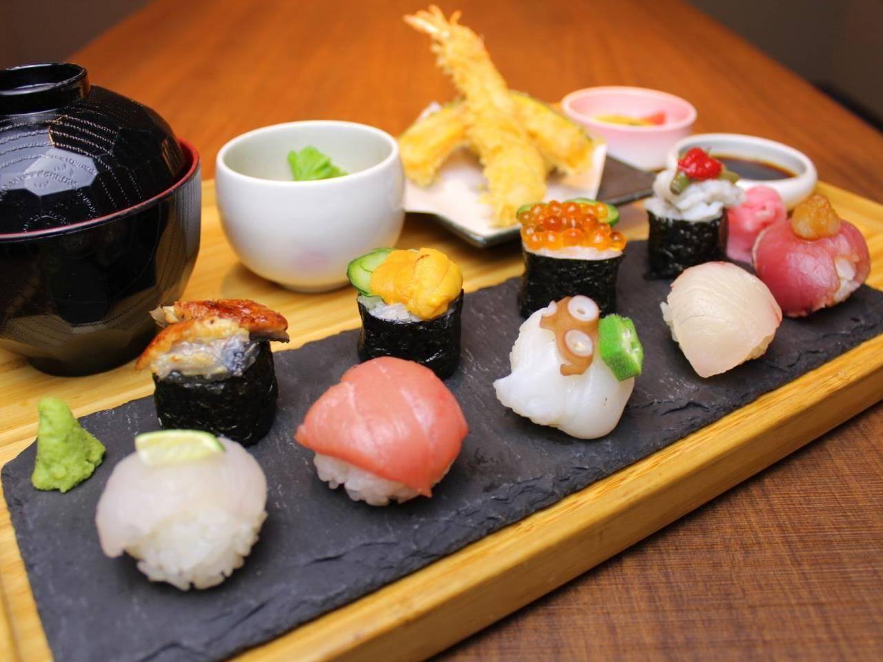 赤身、イクラ、蒸し車エビ、ホタテ、旬の白身、穴子、鉄火巻き、かっぱ巻き、玉子焼きの9貫