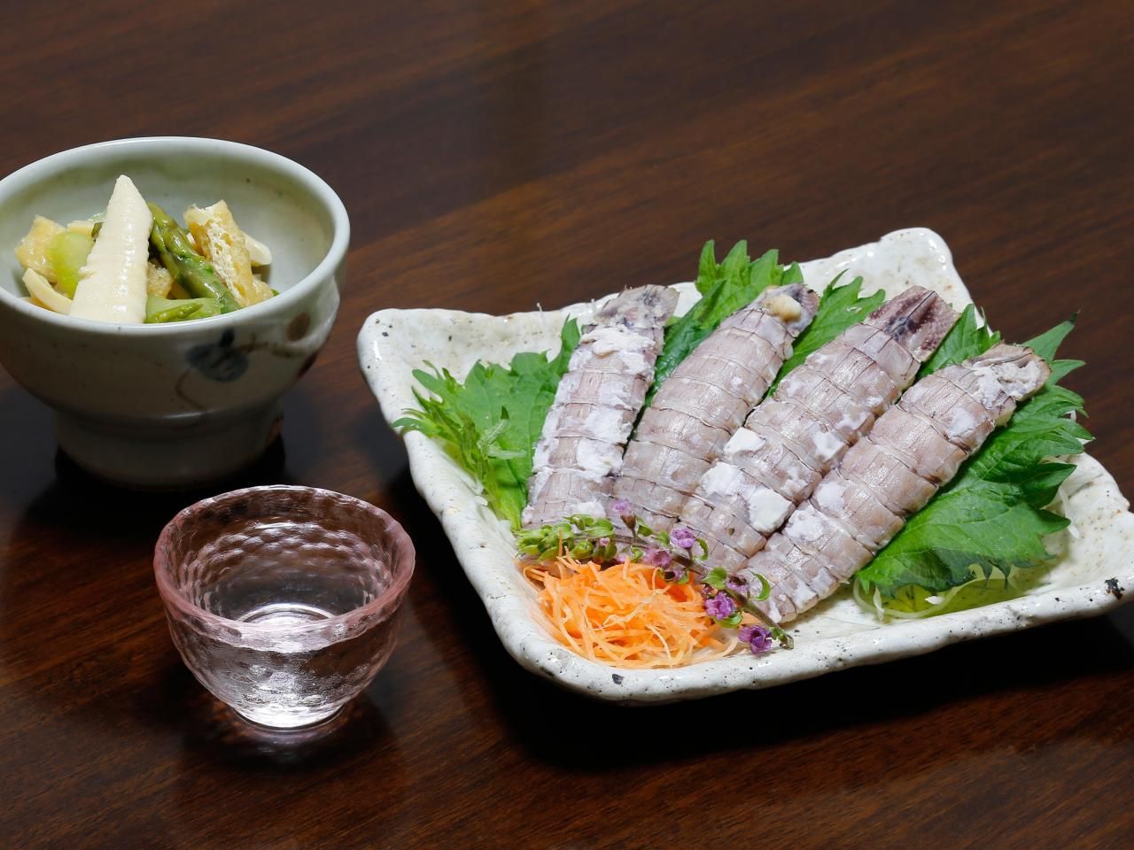 旬のヤリイカを活きたまま刺身へ仕入れ状況により、ご提供できないことがございます。詳しくはお問合せください。- 活イカ刺し品切れ中